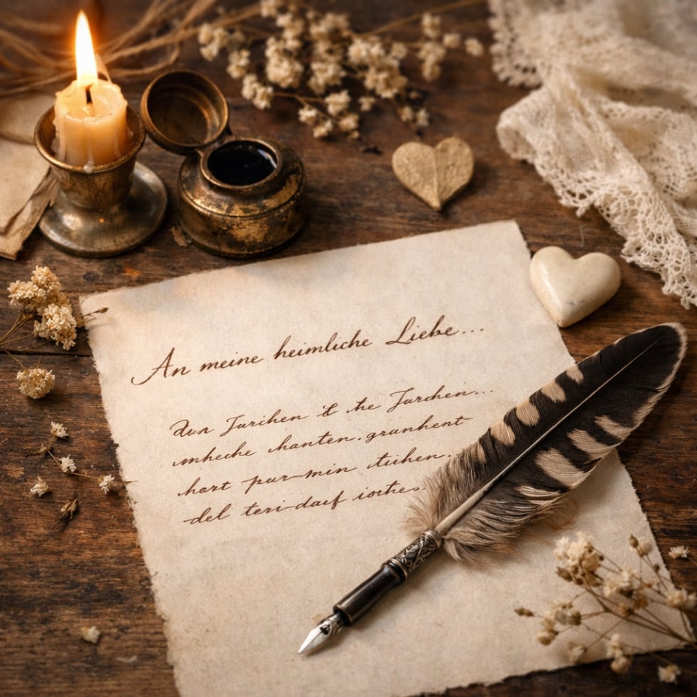 Das Bild eines alten Briefes, geschrieben mit Feder und Tinte, erinnert an genau diese Form der Aufmerksamkeit. Es erzählt von einer Zeit, in der Gefühle nicht inszeniert, sondern formuliert wurden – ruhig, persönlich und oft nur für eine einzige Person bestimmt.