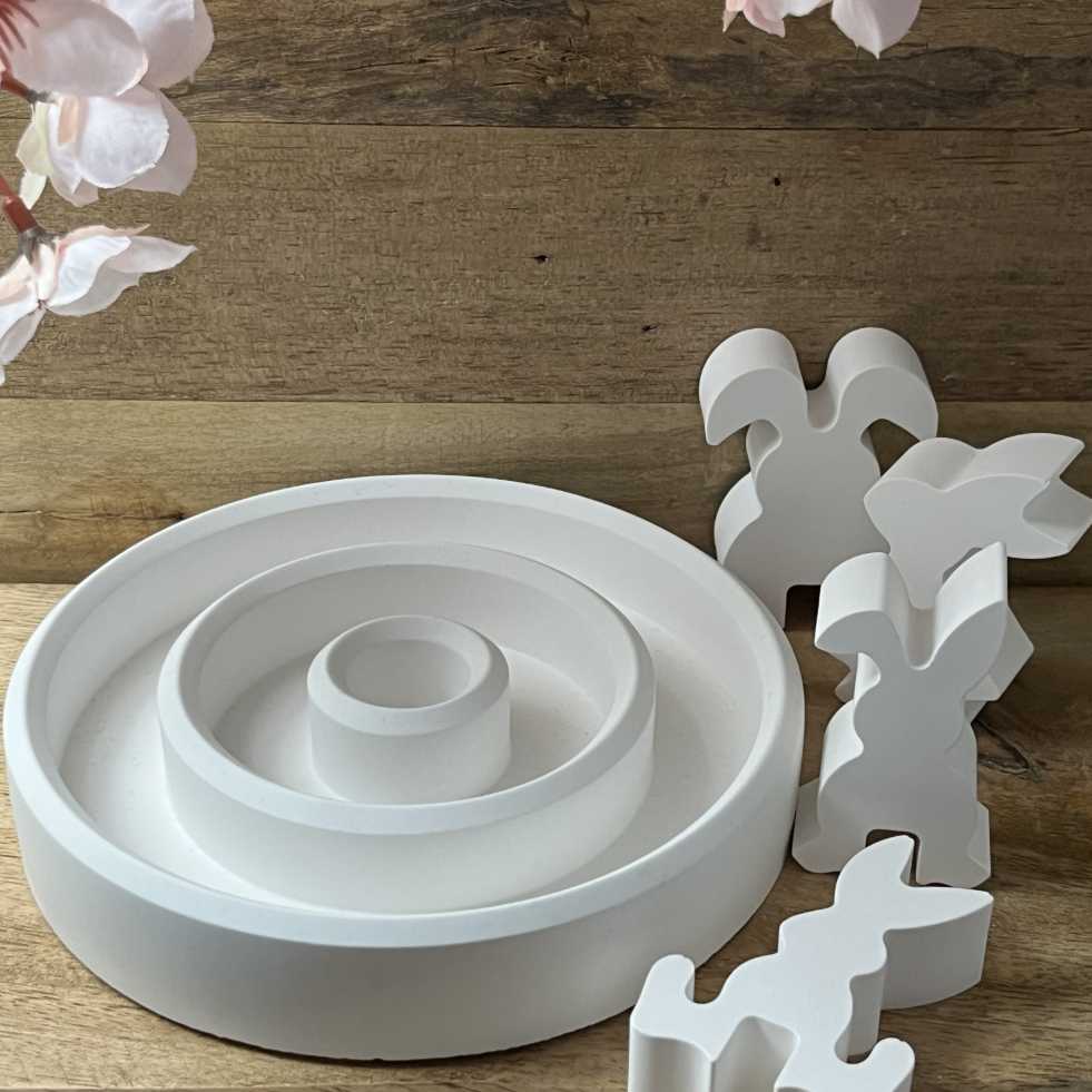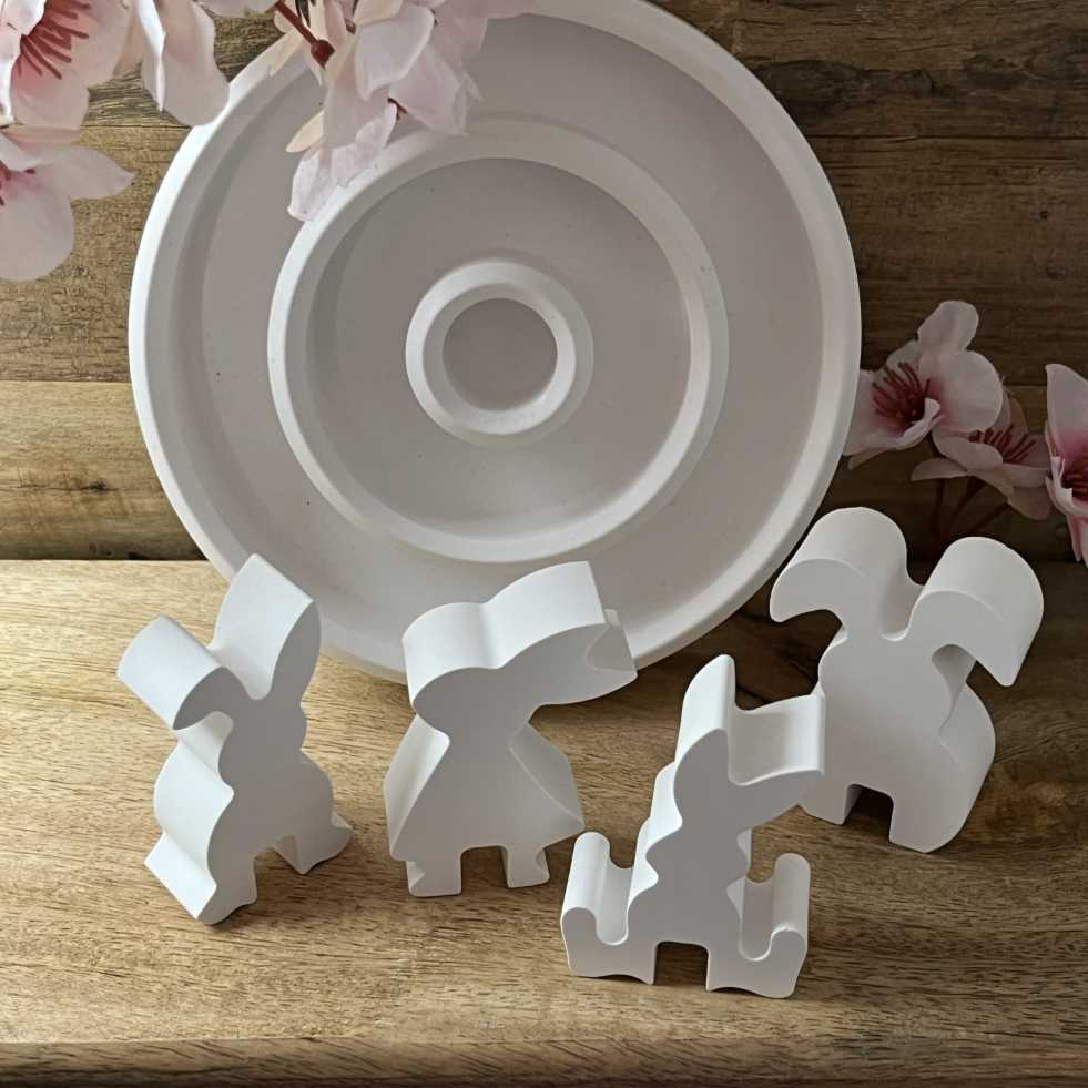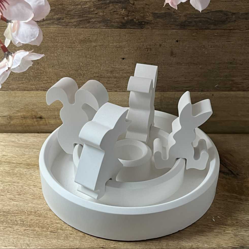 Runder Kerzenhalter mit Hasenfiguren und integrierter Schale für stilvolle Osterdekoration. Die matte Oberfläche und die elegante Form machen sie zu einem echten Blickfang in jedem Wohnraum.