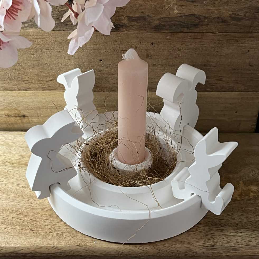 Dekorativer Kerzenhalter mit Hasenfiguren und Schale für eine stimmungsvolle Frühlingsdekoration.