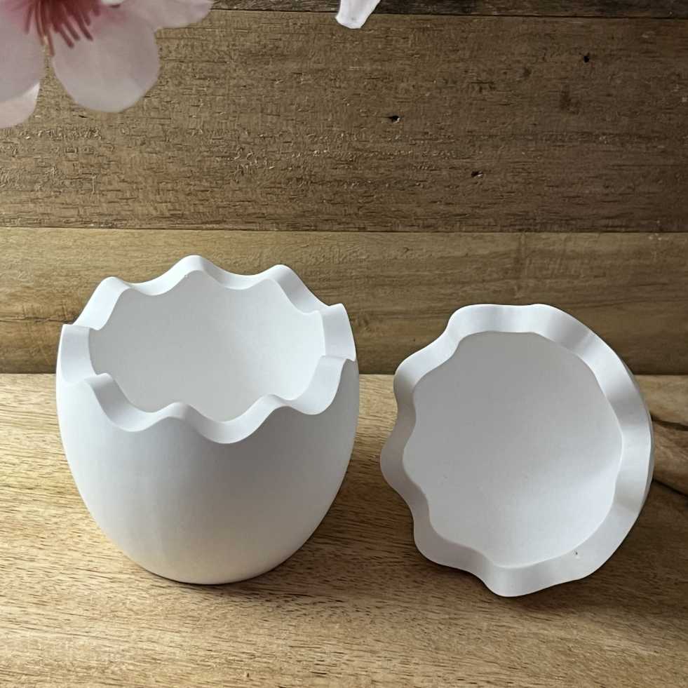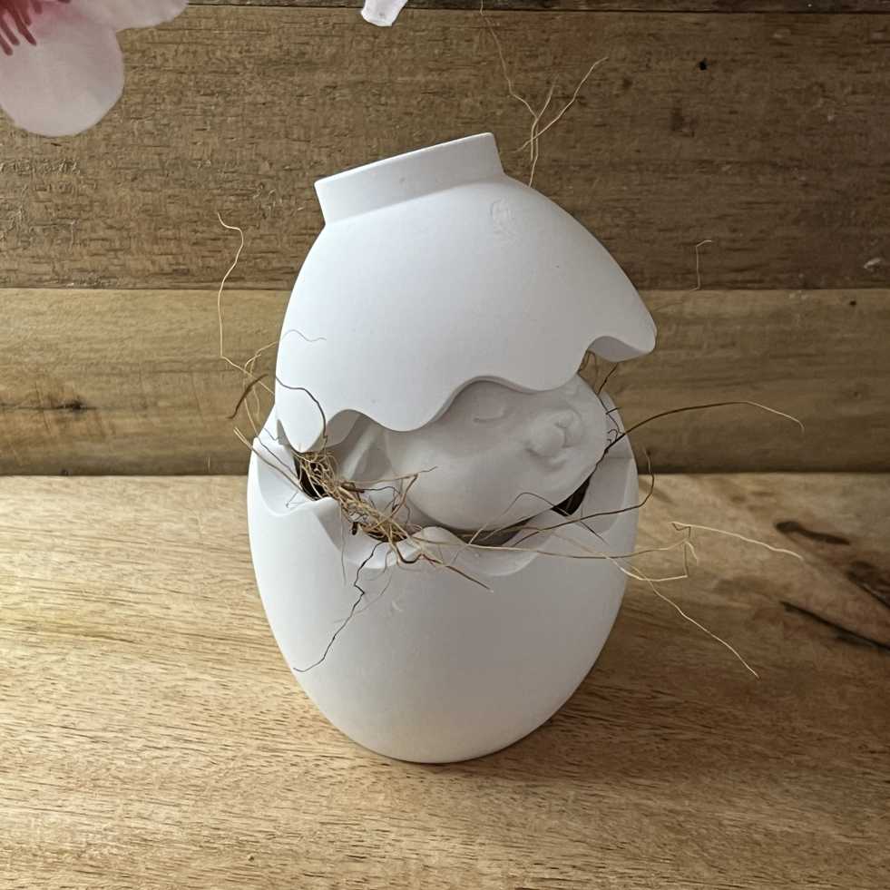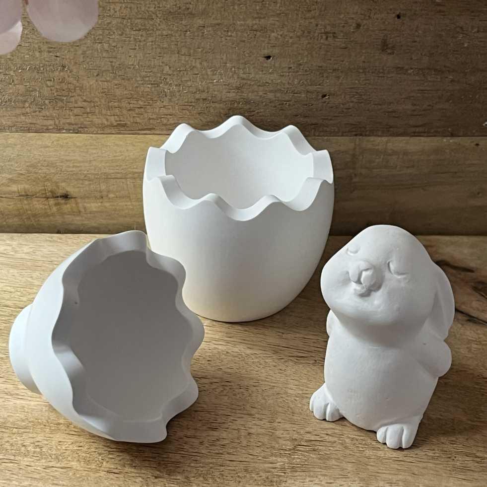 Süßes Oster-Duo: Dieses Set besticht durch einen schmunzelnden Hasen in einer detailreich gestalteten, aufgebrochenen Eierschale. Handgefertigt aus weißer Gießkeramik in Solingen, bringt es minimalistische Gemütlichkeit in deine Frühlingsdeko. Ein echtes Unikat für Puristen.